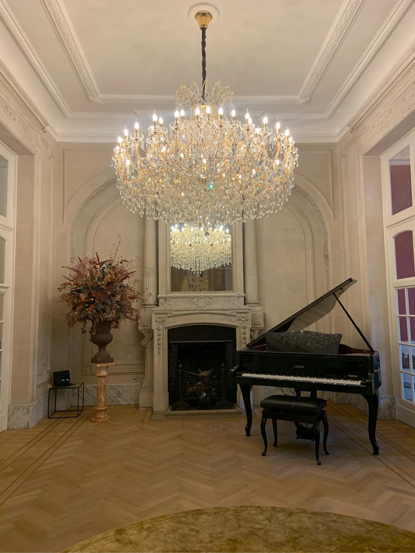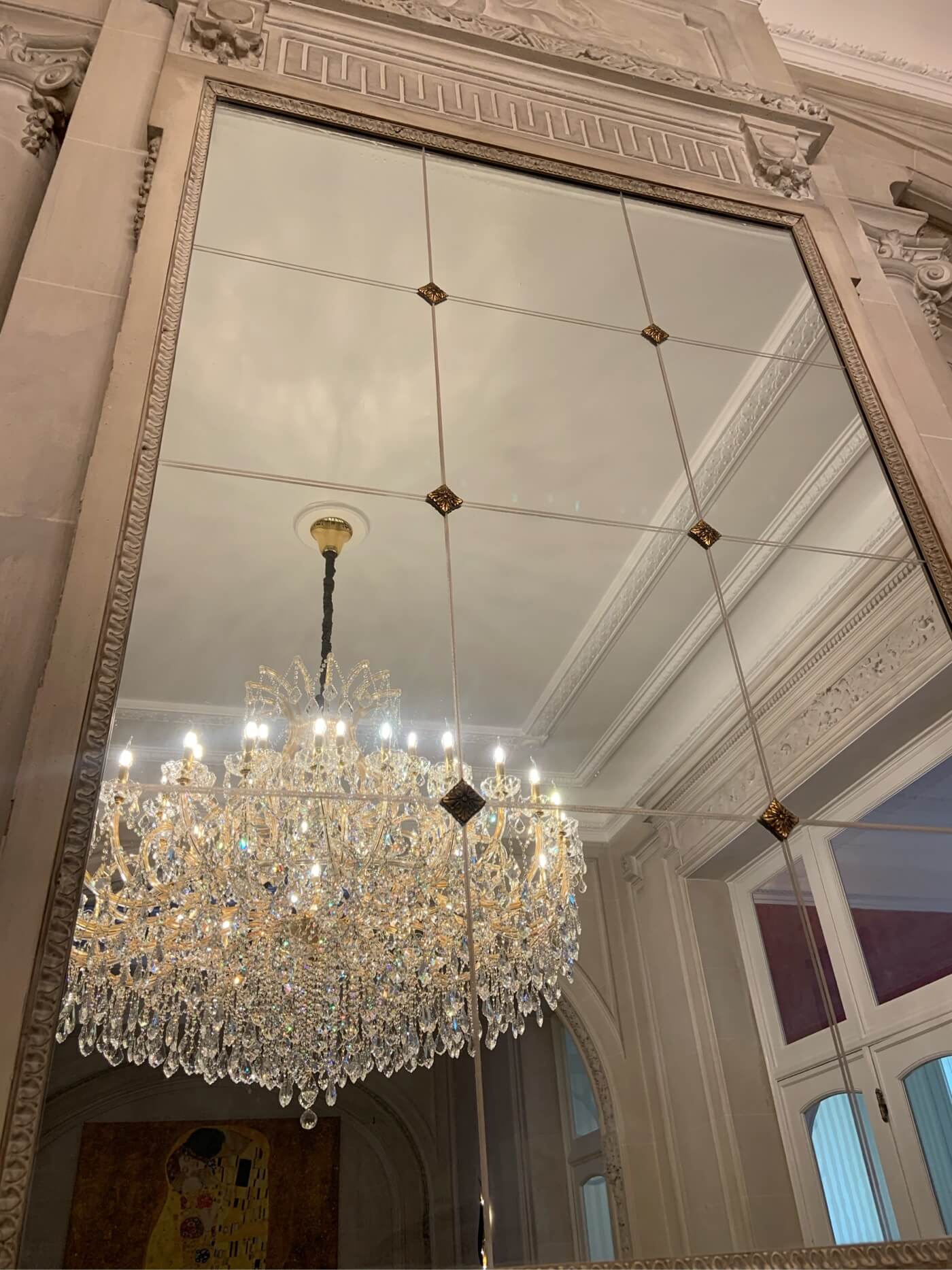 Met een indrukwekkende breedte van 180/196 cm en een hoogte van 150/160 cm, maakt de Jenevá een betoverende indruk in ruimtes met hoge plafonds, zoals hallen en woonkamers. Het ijzeren frame, verfraaid met glasstroken en rozetten, draagt talloze kristallen pegels. Het kristal creëert een prachtig kleurenspectrum wanneer ze worden verlicht door de 45 lichtpunten (E14).