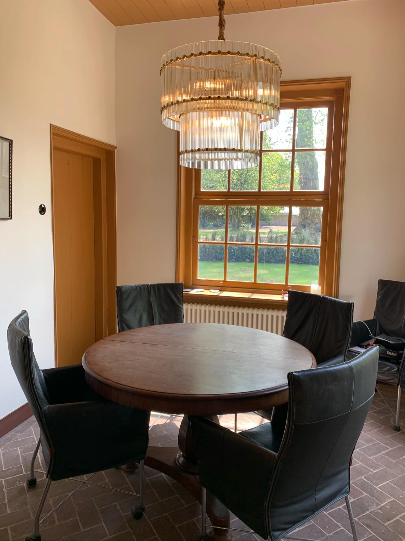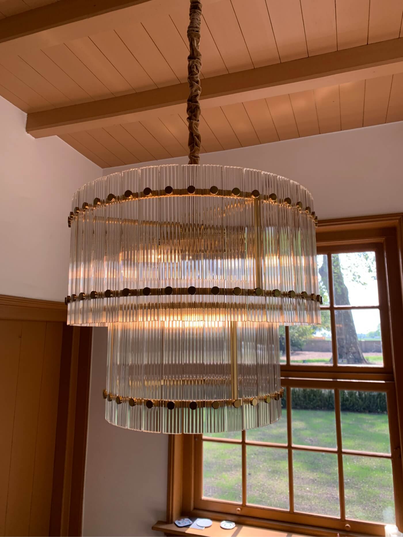 De eerste indruk? Een meesterwerk in evenwicht en detail. Het frame, afgewerkt in een stijlvol brons, ondersteunt de twee ringen - de grotere die de bovenste verdieping siert, en de kleinere die het onderste deel voltooit. De rondom hangende kristallen pegels glinsteren in het licht, waardoor een spektakel van kleuren wordt gecreëerd door de combinatie met de 8 lichtpunten.