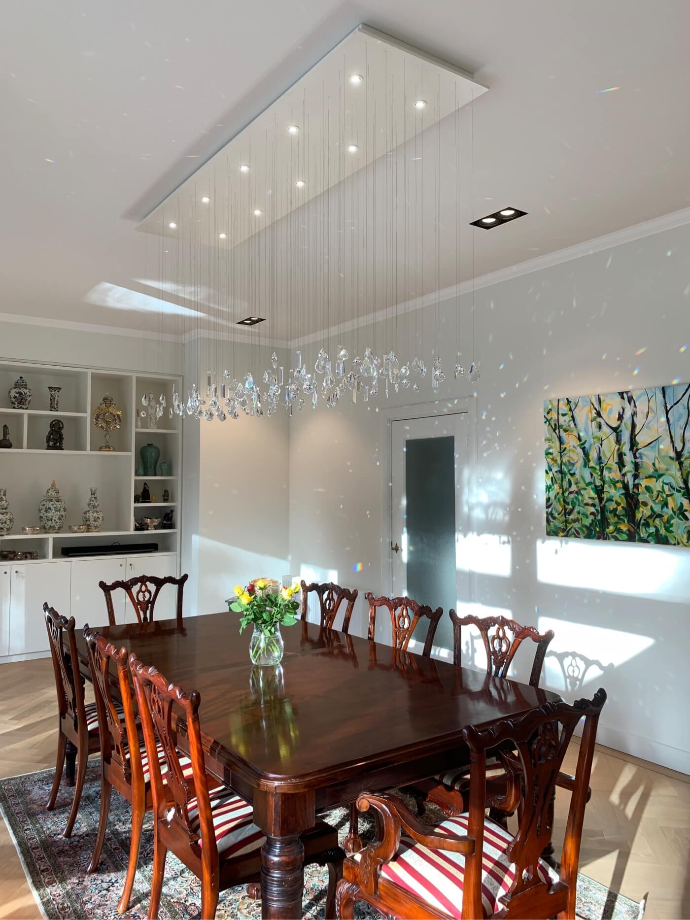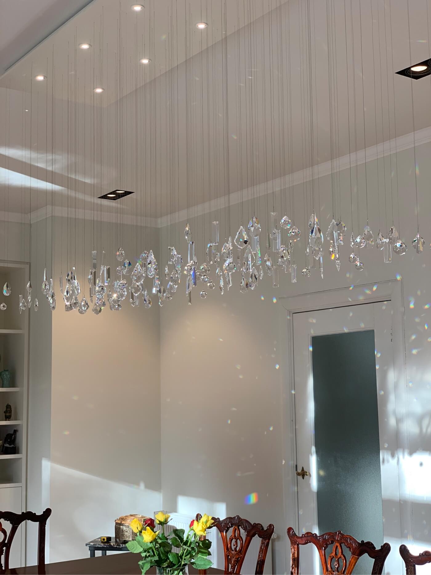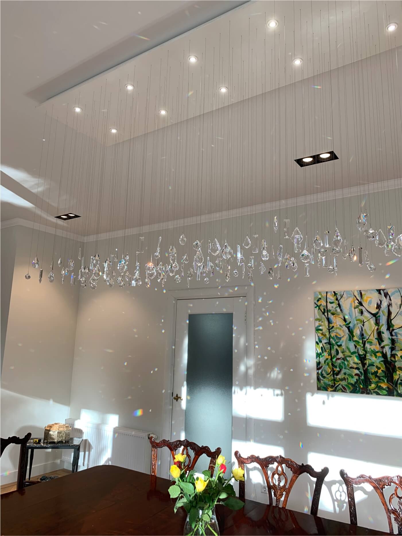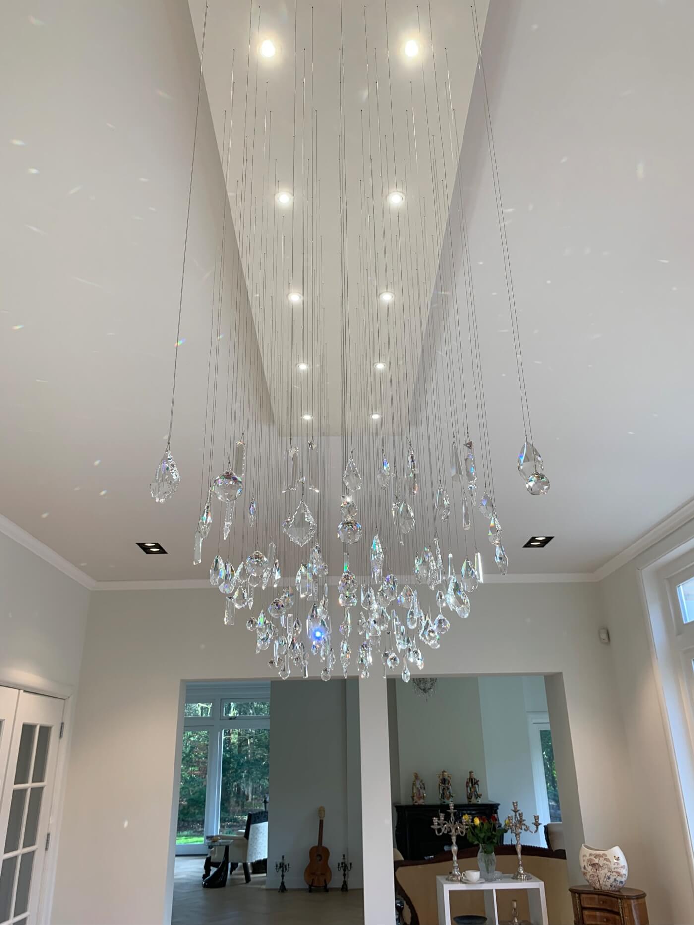 De kristallen flowers van deze kroonluchter hangen elk aan een ultra dun draadje, voor het oog vrijwel onzichtbaar, wat het zwevende effect van het kristal creëert. De floating flower kenmerkt zicht door twee verschillende soorten kristallen: facetgeslepen pegel in combinatie met klaverblad pegel. Deze bijzondere combinatie creëert een unieke schittering en een prachtig 3D-effect in de ruimte.