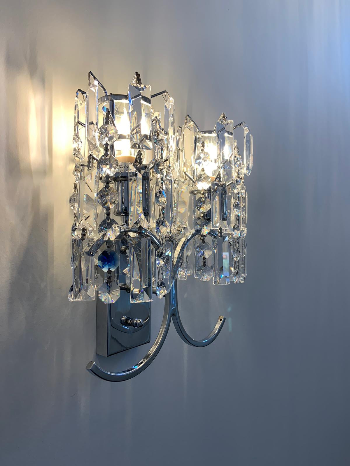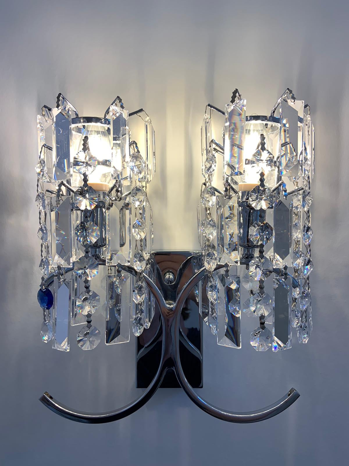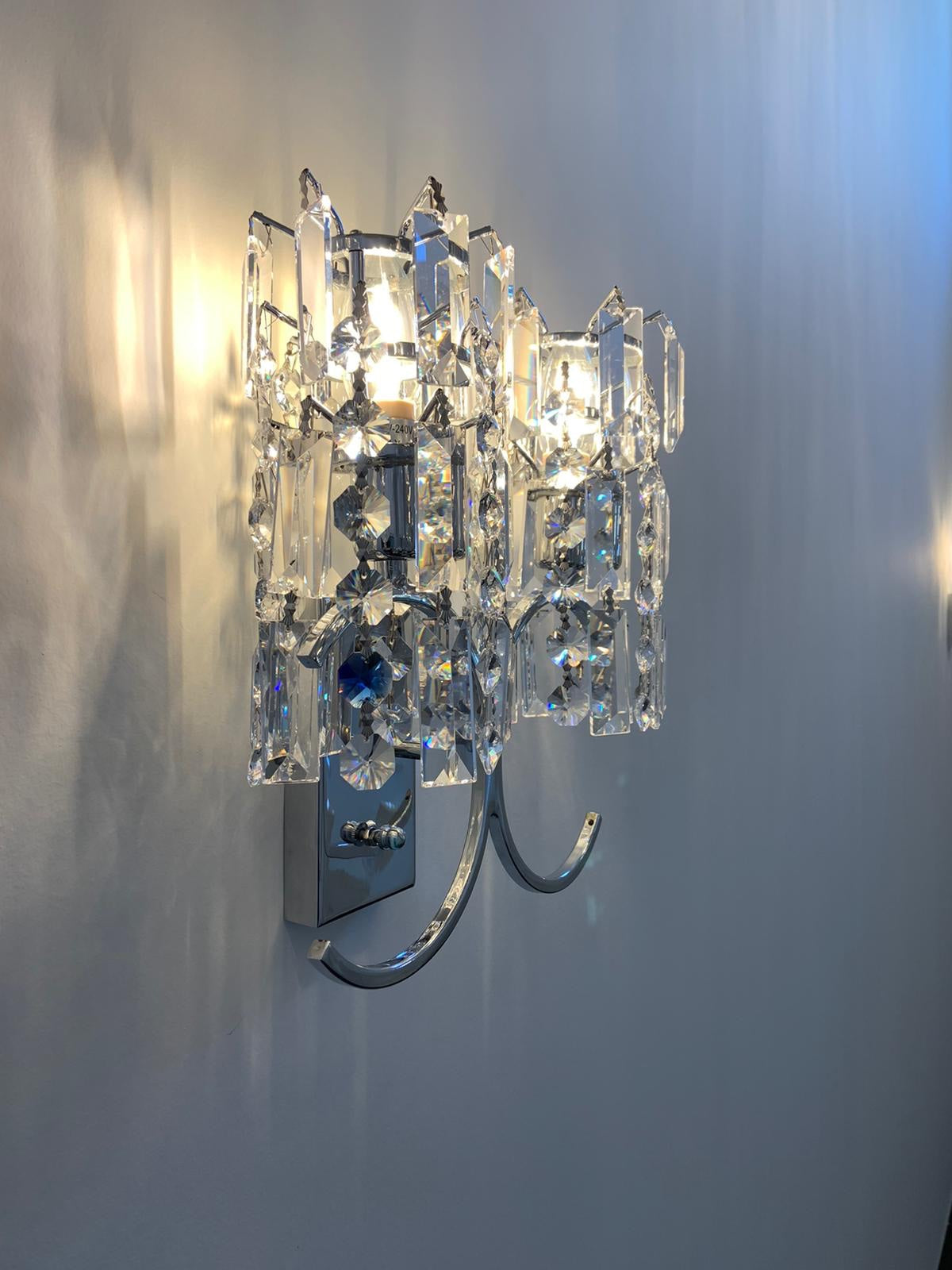 De prachtige V-vormige uitsteeksels aan de bovenzijde zijn versierd met zowel ronde als staafvormige kristallen, die glinsteren als sterren in de nacht. Het unieke aflopende ontwerp zorgt voor een bijzondere en elegante uitstraling, waarbij de kristallen als een betoverende waterval naar beneden vloeien.
